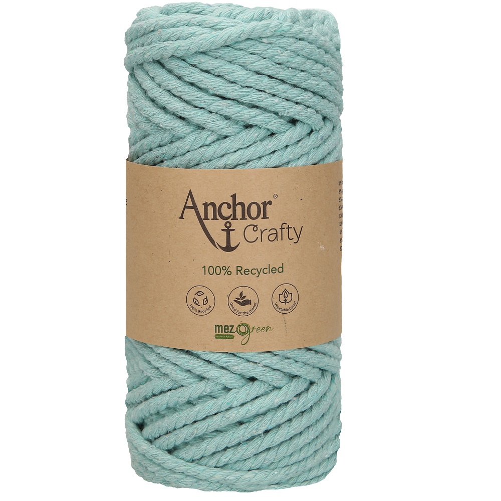 Anchor Crafty 117 Mentolová je 100% recyklovaná příze vyrobená z odpadních textilních a plastových materiálů, díky čemuž je ekologická a udržitelná.