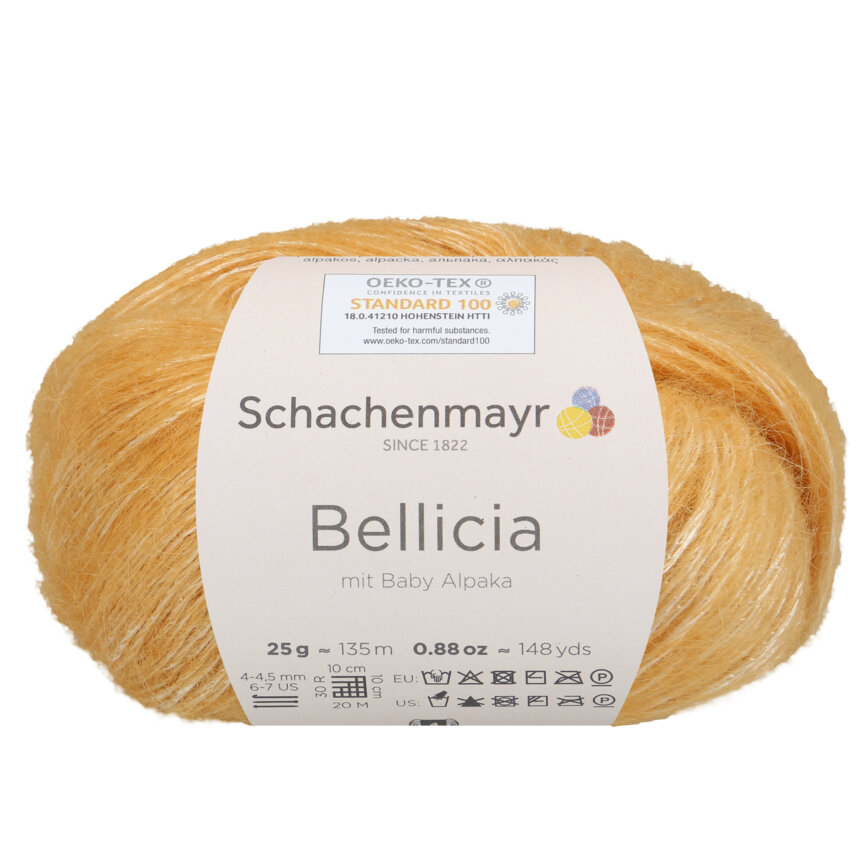 Schachenmayr Bellicia 22 Zlatožlutá je nadýchaná měkoučká a lehoučká směs baby alpaky a viskózy.