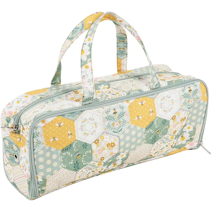 Praktická látková taška s potiskem ve tvaru pláství, kam si poskládáte vše potřebné k pletení či háčkování.